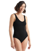 Der bequeme Icebreaeker Merino Body ist die Lösung für Frauen, die im Übergang zwischen Hose und Oberteil empfindlich gegen Zugluft sind. Der dünne Merinostoff ist durch das Ribstrickverfahren besonders elastisch und passt sich der Körperform individuell an, ohne viele Falten zu werfen. Der Komfort von 100% Merinowolle bringt ein natürliches Wärmegefühl und beugt gleichzeitig Überhitzung vor. Der Icebreaker Queens Tank Bodysuit ist maschinenwaschbar im Wollprogramm und spart Ressourcen bei jedem Waschgang, da Merinowolle auch bei 30° hygienisch sauber wird und wegen der geruchsbindenden Wirkung insgesamt auch weniger gewaschen werden muss.