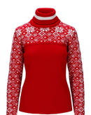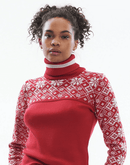 The Dale of Norway Mount Red Sweater is a merino turtleneck sweater for women with a Scandinavian pattern on the upper chest area and on the arms. The extra fine merino wool quality (19.5 microns) keeps you warm and ensures a particularly comfortable climate. The collar is very elastic thanks to the ribbed knitting technique and makes it easier to put on. The merino sweater is machine washable and of excellent quality thanks to being made in Norway.