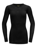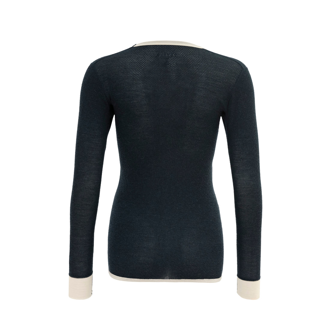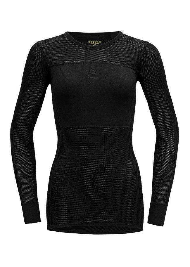 The Devold Wool Mesh Woman Shirt is a mesh-knitted Merino functional underwear that combines particularly high vapor permeability with a fabric structure that binds air cushions. The innovative Merino mesh fabric is extremely stretchy even without elastane. This means that the long-sleeved shirt adapts to your body shape like a second skin and is particularly suitable for high-performance sports such as speed ski touring, cross-country skiing or interval training in winter. Especially in cold outside temperatures and at the same time heavy sweating, the high breathability of the mesh fabric combined with the heat retention of the Merino wool when wet and damp is of crucial importance for preventing colds. A normal, 190g/m² thick Merino fabric is used in the chest area to ensure opacity on the one hand and to increase the level of warmth in this cold-sensitive area on the other.