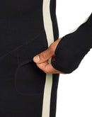 Die integrierte und bis über die Nase reichende Balaclava passt unter jeden Skihelm und hat eine Pferdeschwanzöffnung auf der Rückseite. Wenn sie dir zu warm wird oder du mehr Luftzufuhr brauchst, lässt sie sich durch einen halbseitig offenen Abschluss vorne auch jederzeit vollständig nach hinten klappen, so dass der Kragen uneingeschränkt frei wird. Für den kleinen Toilettengang gibt es vorne eine überlappte Öffnung, während sich für den großen Toilettengang auf der Rückseite eine überdeckte und mit Reißverschluss erweiterbare Öffnung befindet. Der langgezogene Frontreißverschluss kann zum Belüften genutzt werden und erleichtert das An und Ausziehen. Daumenschlaufen halten die Ärmel in Position und verhindern ebenfalls ein Eindringen von Schnee unter dem Handschuh. Auf der linken Seite gibt es außerdem noch eine kleine Tasche für die Kreditkarte oder den Skipass.