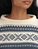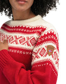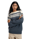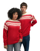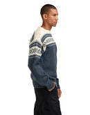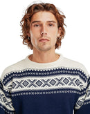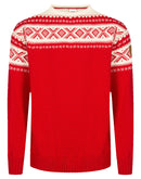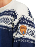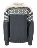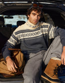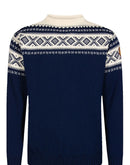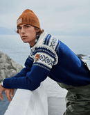 The Dale of Norway Cortina 1956 Sweater is a chunky knit and warm wool sweater for men with a pattern that is very popular in Norway and runs all the way around the chest and back. The Norwegian wool is robust and durable and matches the timeless design. The warm sweater has a casual cut, so you can wear a shirt or turtleneck underneath for more comfort.