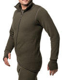 The Woolpower Full Zip Jacket 400 is a thermal merino jacket with a terry cloth structure on the inside, which uses a long-loop knitting technique to create plenty of space for warm air cushions and thus achieves excellent heat output. The merino midlayer made in Sweden can be worn as a second layer over underwear and offers excellent heat retention even when you are outside for a long time without much movement. The Ullfrotte 400 series from Woolpower is therefore the first choice not only for winter sports in extreme cold, but also as workwear made of merino wool, e.g. for hunters, police or the armed forces.