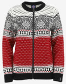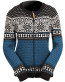 The Martha zip-up cardigan is extremely comfortable and suitable for every day and every occasion. The jacket is knitted from a fine blend of 70% polyacrylic and 30% wool. A dotted pattern adorns the shoulders around the neck area and the oval neckline and the slightly tailored fit creates an elegant, feminine silhouette. The classic Norwegian pattern covers the chest area and in narrow stripes also the areas above the ribbed knitted cuffs on the sleeves and waistband. The jacket is open at the front and can be closed with a zip. Martha also looks great worn open, like a light jacket when it's warm enough or you're wearing a smart shirt or top underneath.