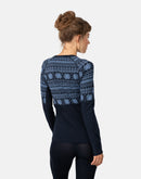 The Kari Traa Vilma Longsleeve is a comfortable and warm sports underwear for the whole winter thanks to 100% merino wool in medium thickness and has a timeless and fresh design thanks to the classic Norwegian pattern. This means that the long-sleeved shirt can be used both as functional underwear for winter sports and as chic clothing for everyday use. The Vilma Longsleeve is 100% microplastic-free and the merino wool used is animal welfare certified and skin-friendly. The fine wool quality offers the highest level of comfort, reliable odor inhibition and a wide range of uses.