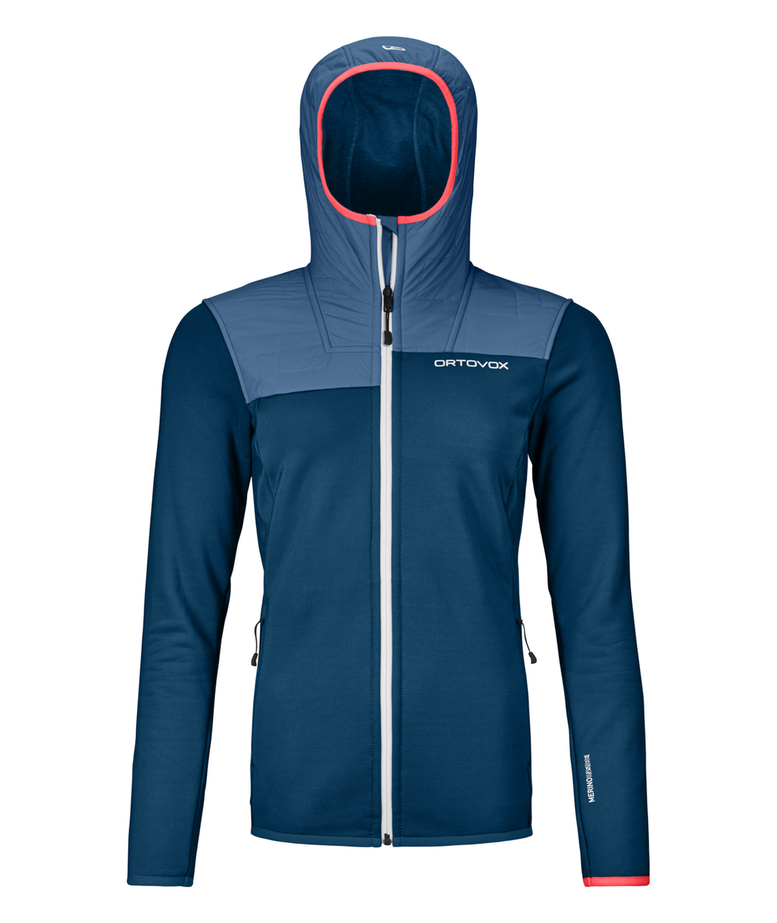 Thanks to the finest merino wool on the inside, this Ortovox Fleece Plus Hoody for women feels pleasantly soft on the skin. The ergonomic cut and the use of elastic materials in the outer fabric ensure a sporty fit and at the same time plenty of freedom of movement. The two side pockets are ideal for storing various tour accessories or simply for warming your hands. The extra thick fabric and the warm hood make the jacket ideal for very cold days. The shoulder reinforcements protect against both moisture and abrasion from the backpack.
