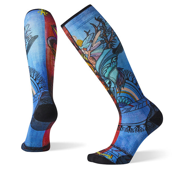 These thin merino ski socks for women use an innovative printing technology to bring color to your feet with this extraordinary motif. The 4-way elastic fit is cut narrower at the heel especially for women and has an overall slimmer shape around the calf. The Smartwool Performance Ski Socks with the artistic mountain print sit wrinkle-free without constricting. The toe and heel areas are reinforced. The elaborate stay-in-place fit and the high moisture absorption prevent the formation of blisters. Smartwool socks are made in the USA with mulesing-free merino wool and are robust and long-lasting.