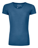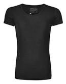 Single-coloured functional T-shirt for women from the Ortovox 150 Cool series, in which merino wool and Tencel® (natural wood-based fibre) ensure outstanding comfort. The natural fibre combination also makes the Ortovox T-shirt more breathable and stable, which is an advantage, especially in high outside temperatures and with a backpack. The Merino-Tencel® shirt reliably binds odours and can be worn several times in a row on multi-day tours without washing.