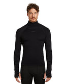 The Merino Longsleeve Roll Neck 300 for men has a very high turtleneck that can be pulled over the nose and is the warmest long-sleeved functional shirt from Icebreaker. Thanks to a particularly fine merino wool quality with a fiber thickness of just 15.5 microns and the Lux Interlock knitting process, this merino turtleneck is particularly smooth and extremely soft on the skin. The 300g/m² fabric thickness provides reliable warmth even in sub-zero temperatures and still prevents rapid overheating when activity levels change. Flat seams and a pre-shaped cut with raglan sleeve construction prevent friction and offer freedom of movement.