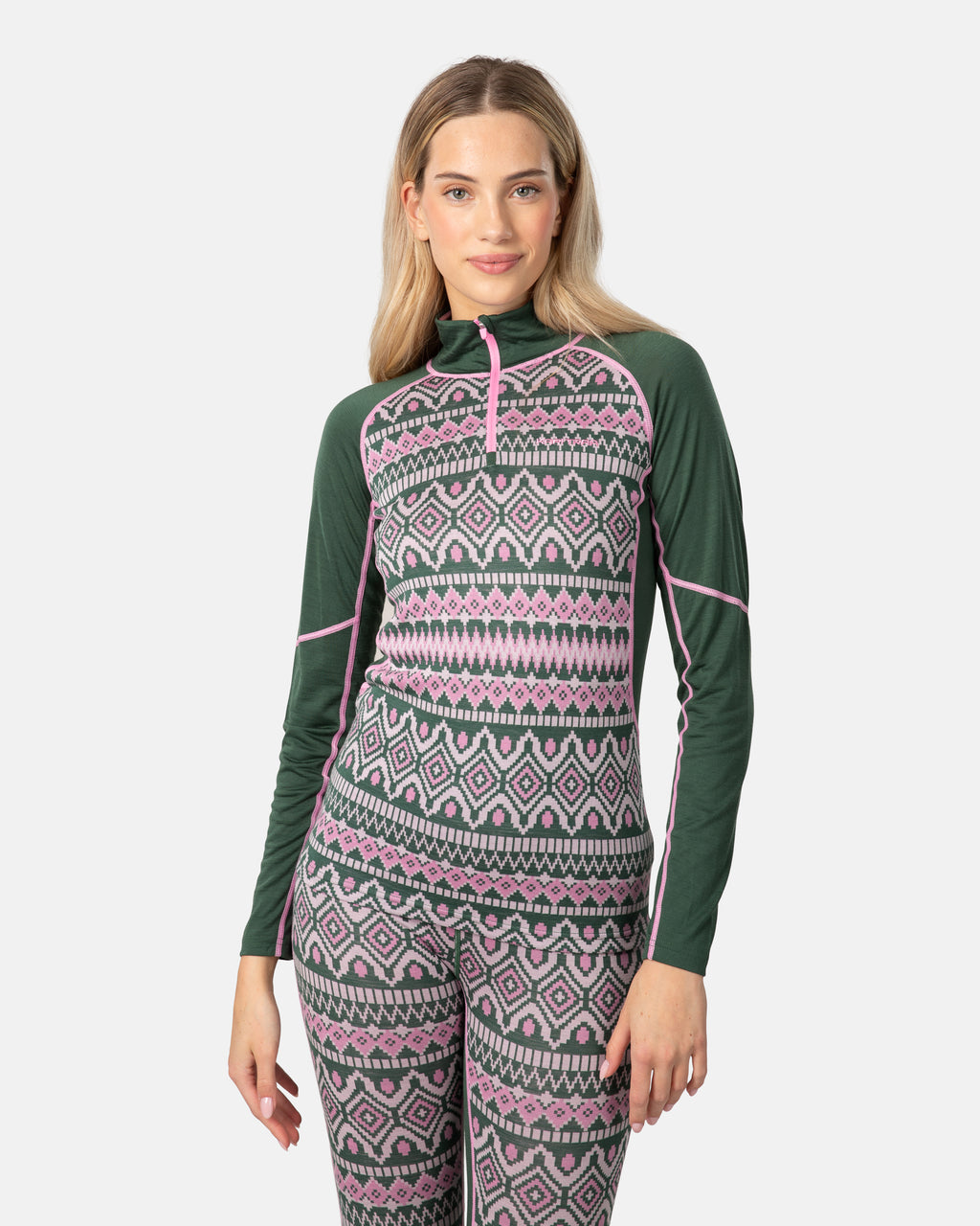 The Aclima Marius Mock Neck is a medium-thick half zip merino long sleeve for women with an all-round Norwegian pattern. The zip is hidden behind the back so that the chin is protected. Thanks to 100% merino wool in 19.5 micron...