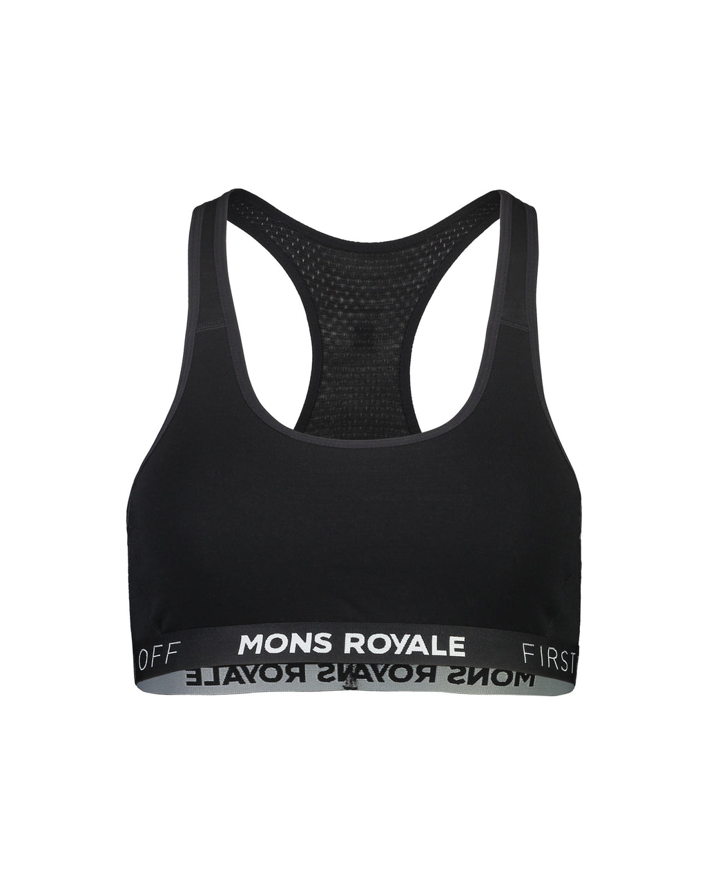Soutien-gorge de sport en laine mérinos à maintien moyen. Le tissu Merino Mesh respirant au dos et la ceinture douce avec l'inscription Mons Royale assurent un excellent ajustement du soutien-gorge Merino et un climat agréable...