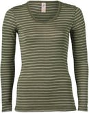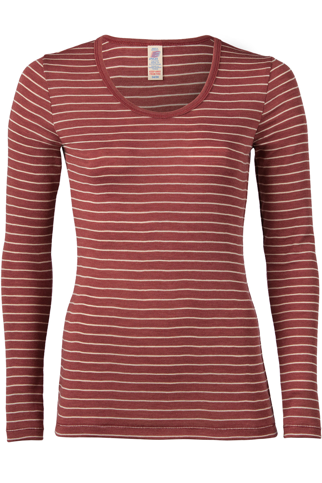 Das gestreifte Damen Merino-Seide Langarmshirt vom deutschen Fabrikanten Engel hat eine angenehm weiche Naturfasermischung im Mischverhältnis von 70 zu 30. Merinowolle und Seide ergänzen sich hervorragend und schaffen ein ausgewogenes Klima auf der Haut. Der Schweiß wird schnell aufgenommen und es entstehen so gut wie keine Gerüche. Das elastische Damen Longsleeve hat einen leichten Ausschnitt und ist ein universeller und bequemer Firstlayer für den alltäglichen Gebrauch und problemlos maschinenwaschbar bei 30°.