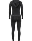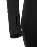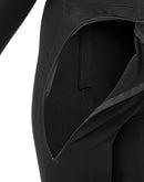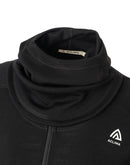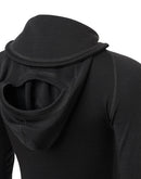 Der Merino Overall hat eine Kapuze mit integriertem Neckwarmer, welche sich entweder vollständig nach hinten klappen lässt oder als hoher Stehkragen umfunktionieren lässt. Lange Ärmel mit Daumenschlaufen schützen den Übergang zwischen Handschuhen und Jacke vor dem Eindringen von Kälte oder Schnee. Der langgezogene Frontreißverschluss lässt sich durch die 2-Wege Funktion auch als Belüftung nutzen. Am Hintern gibt es ebenfalls einen bis zu den Oberschenkeln umlaufenden 2-Wege Reißverschluss, um den Toilettengang unterwegs zu erleichtern.