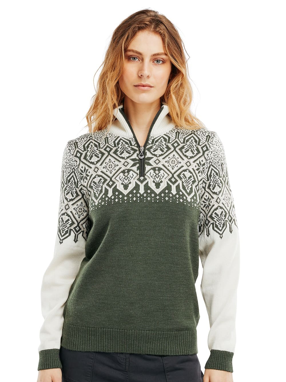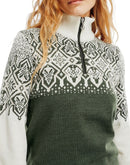 Der Dale of Norway Christmas Sweater ist ein kuschlig weicher Merinopullover für Damen mit winterlichem Norwegermuster auf Vorder-und Rückseite. Doch nicht nur das Design stimmt auf die kalte Jahreszeit ein, sondern auch die hohe Wärmeleistung. Dank 100% Merinowolle ist der Norwegerpullover ein zuverlässiger Wärmespender und bietet ein Wohlfühlklima der besonderen Art. Der Quarter-Zip Kragen erleichtert das An-und Ausziehen und setzt einen farblichen Kontrast zum Muster.