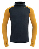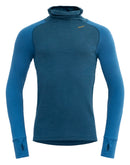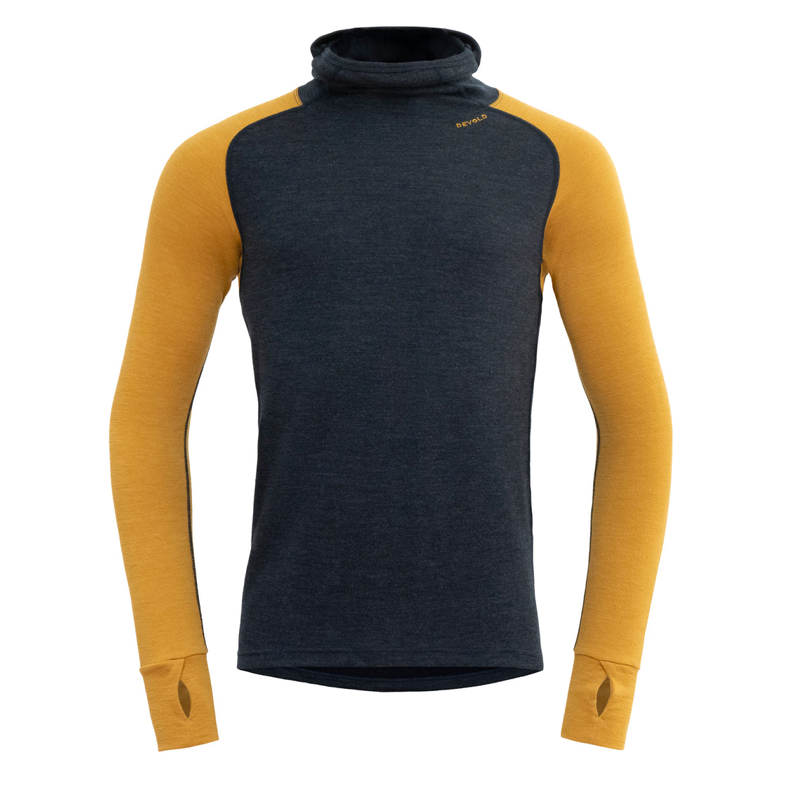 Der Devold Expedition Merino Silk Hoodie für Herren ist eine zweischichtige Funktionswäsche für harte winterliche Bedingungen. Die Innenseite besteht aus 100% feiner Merinowolle, während die Außenseite für eine höhere Strapazierfähigkeit mit 10% Seide verstärkt wird und zusätzlich wasserabweisend behandelt ist. Diese Materialkombination bietet einen hervorragend weichen Tragekomfort. Die verstärkte Außenseite sowie eine nahtfreie Schulterpartie sind für das Rucksacktragen optimiert und ein langer Schnitt verhindert Kältebrücken im Übergang zur Hose. Ebenso verhindern Daumenschlaufen das Eindringen von Schnee und Wind am Ärmel. Die Kapuze ist gleichzeitig eine Sturmhaube und ist im Mundbereich mit Atemlöchern versehen. Die Merinowolle verhindert das Auskühlen durch beim Ausatmen entstandene Kondensationsfeuchtigkeit. Das Mundstück lässt sich durch die überlappende Konstruktion auch unter das Kinn ziehen, wenn der Sauerstoffbedarf bei hoher Anstrengung steigt. Ebenso kann die Kapuze problemlos nach hinten runtergezogen werden und fungiert so als hoher Wärmekragen.