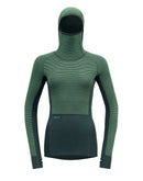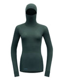 Das Devold Tuvegga Kapuzenshirt für Damen ist eine Neuheit auf dem Merino Unterwäsche Markt, denn es lässt sich beidseitig tragen und vereint somit eine warme und eine kühlere Seite in einem Stück. Je nach Witterung oder sportlicher Intensität lässt sich das Merino Longsleeve durch Wenden der Seite den Temperaturgegebenheiten anpassen. Die glatte Seite nach innen getragen bewirkt eine schnelle Schweißabsorbierung, da die grob gerippte Außenseite dann eine größere Oberfläche bietet (Kapillareffekt) und sich eine kanalisierende Wirkung entfaltet. Dreht man die Rippenstruktur auf die Innenseite, entstehen zusätzliche Luftpolster und verstärken die Wärmeleistung. Die bereits von Natur aus überragende Temperaturregulierung von Merinowolle wird somit noch um weitere Flexibilität ergänzt. Die Kapuze passt auch unter einen Helm und die Daumenschlaufen schützen im Übergang zu den Handschuhen vor Schnee und Kälte. Unter den Achseln und am oberen Rücken befindet sich ein dünnerer Merino Mesh Einsatz, um für gezielt platzierte Ventilation beim Rucksacktragen und bei starker Anstrengung zu sorgen.