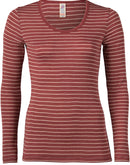 Das gestreifte Damen Merino-Seide Langarmshirt vom deutschen Fabrikanten Engel hat eine angenehm weiche Naturfasermischung im Mischverhältnis von 70 zu 30. Merinowolle und Seide ergänzen sich hervorragend und schaffen ein ausgewogenes Klima auf der Haut. Der Schweiß wird schnell aufgenommen und es entstehen so gut wie keine Gerüche. Das elastische Damen Longsleeve hat einen leichten Ausschnitt und ist ein universeller und bequemer Firstlayer für den alltäglichen Gebrauch und problemlos maschinenwaschbar bei 30°.
