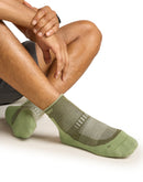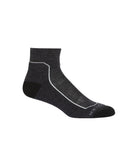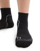 Die kurzen Herren Merino Wandersocken Hike+ Lite Mini halten deine Füße beim Wandern in Top Form. Die anatomisch geformte Sockenspitze sorgt für eine optimale Passform und strategische Polsterzonen bieten ein Maximum an Tragekomfort. Icebreaker Merinosocken sorgen speziell beim Einsatz mit wasserdichten Wanderschuhen für ein trockenes Gefühl auf der Haut, weil die Wolle sehr viel Feuchtigkeit puffern kann. Die infolge weniger aufgeweichte Haut ist wesentlich besser vor Blasenbildung geschützt. Diese Eigenschaft ist besonders wichtig, da die Membranporen von wasserdichten Schuhen schnell verstopfen, weil Schuhe nicht wie Membrankleidung gewaschen werden können, um die Poren wieder frei zu machen.
